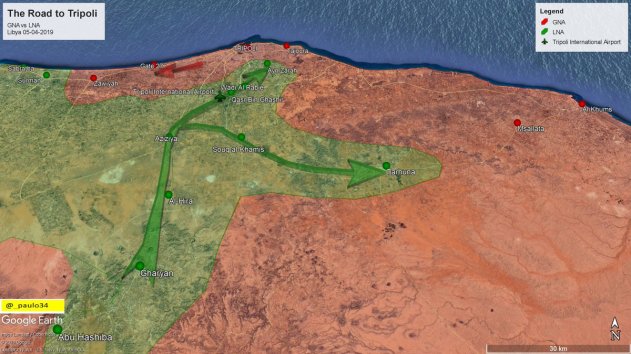 В целом, Хафтар пытется поджать Триполи с юга и отрезать город от остальной Ливии. Одна группа опирающаяся на Зинтан должна отрезать Триполи от Завии, а другая, обходя Триполи с юга, должна после взятия Азизии и Тархуна, выйти к прибрежной дороге к востоку от Триполи. Окружив Триполи и лишив правительство возможности подтягивать подкрепления из Завии и Мисураты, Хафтар сможет начать штурм пригородов Триполи, во время которого можно ожидать перехода части столичных группировок на сторону ЛНА, что обвалит организованное сопротивление.