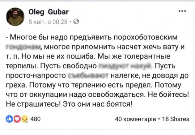 — Многое бы надо предъявить порохоботовским гон…нам, многое припомнить насчет жечь вату и т.п. Но мы не их пошиба. Мы же толерантные терпилы. Пусть свободно пи…дуют на…й. Пусть просто-напросто съе…вают налегке, не доводя до греха. Потому что терпению есть предел. Потому что от оккупации надо освобождаться. Не бойтесь! Не страшитесь! Это они нас боятся!