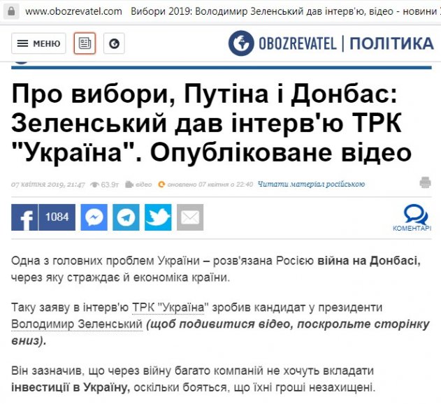 Но, сперва, я вернусь к интервью кандидата Зеленского телеканалу Ахметова ТРК «Украина», которое перепечатал у себя укробандеровский сайт «Обозреватель», кстати, запрещенный на территории России.