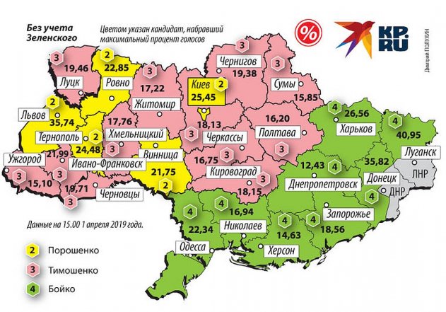 - в остальной, оккупированной Украиной, Новороссии после Зеленского лидируют условно «пророссийские» Бойко и Вилкул;