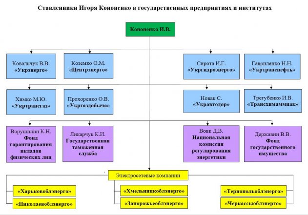 Ставленникам Кононенко в государственных предприятиях и институтах являются: Всеволод Ковальчук (НЭК «Укрэнерго»), Олег Коземко (ПАО «Центрэнерго»), Игорь Сирота (ПАО «Укргидроэнерго»), Николай Гавриленко (ГП «Укртранснефть»), Мирослав Химко (ГП «Укртрансгаз»), Олег Прохоренко (ДП «Укргаздобыча»), Славомир Новак (ГП «Укравтодор»), Владимир Державин (Фонд государственного имущества Украины), Константин Ворушилин (Фонд гарантирования вкладов физических лиц), Константин Ликарчук (Государственная таможенная служба Украины), Игорь Трегубенко (ГП «Трансхимаммиак»), Дмитрий Вовк (Национальная комиссия регулирования энергетики).