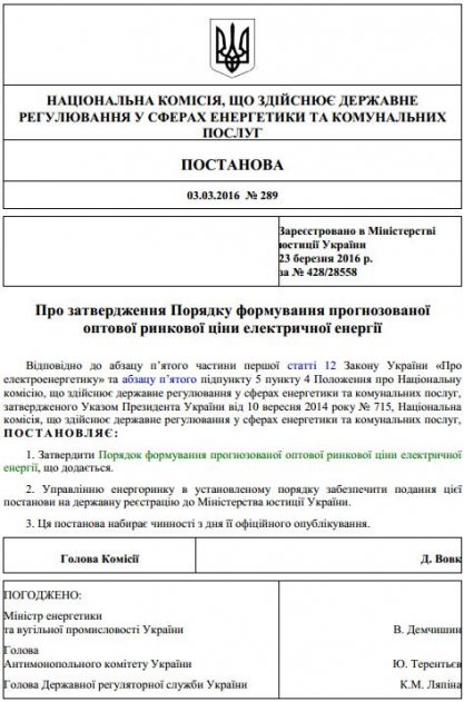 Постановление НКРЭКУ № 289 от 03 марта 2016 г. о порядке формирования прогнозной оптовой рыночной цены электроэнергииСледовательно, изолировав Украину от донецкого угля и искусственно создав острый дефицит электроэнергии в стране, схема, придуманная Р.Ахметовым и одобренная П.Порошенко стала безальтернативной.
