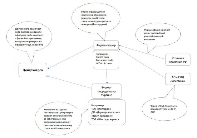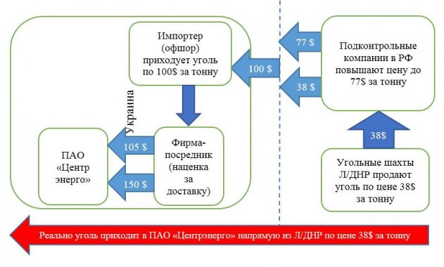 Наценка в размере около 100 долларов с тонны выводится через подставные компании в оффшоры и оседает на счетах многочисленных фирм-посредников (связанных с окружением Порошенко), стоящих между импортером угля и конечным потребителем. В дальнейшем сверхприбыль распределяется между собственниками в процентном соотношении 50/50 частной ДТЭК и управляющими государственной ПАО «Центрэнерго» в лице Ахметова с одной стороны и Порошенко, Кононенко с другой.