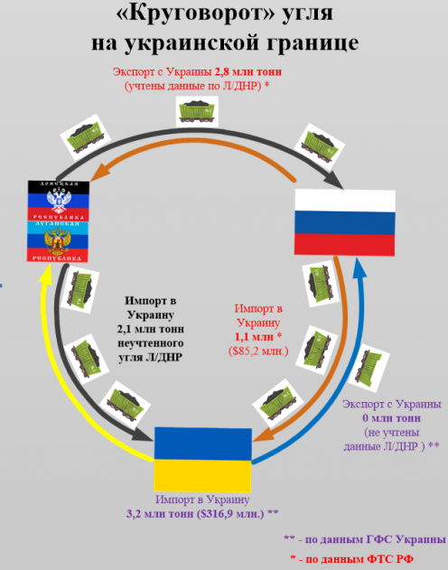 Объем угля, который добывает Л/ДНР и продает в Россию, составляет 2,8 млн. тонн (2,1 млн. тонн из которых возвращается в Украину). Так как Л/ДНР являются непризнанными республиками и юридически не существуют для ФТС России, все поставки из Л/ДНР оформляются с использованием украинских юридических лиц. В противном случае ФТС не сможет идентифицировать продукцию Л/ДНР.