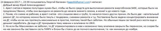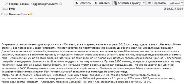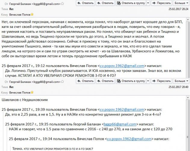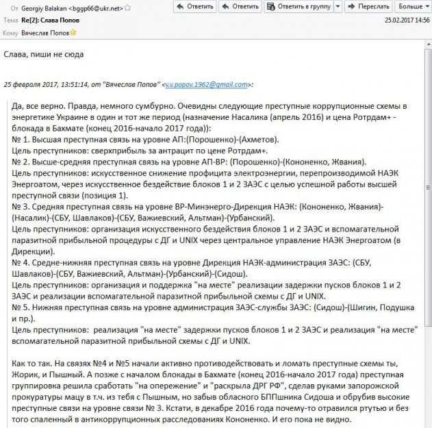 Отдельного внимания заслуживает история с Запорожской АЭС, а в частности, переписка в феврале-марте 2017 года между директором ООО «Экспертный центр» Вячеславом Поповым и советником президента Национальной атомной энергогенерирующей компании (НАЭК) «Энергоатом» Георгием Балаканом.