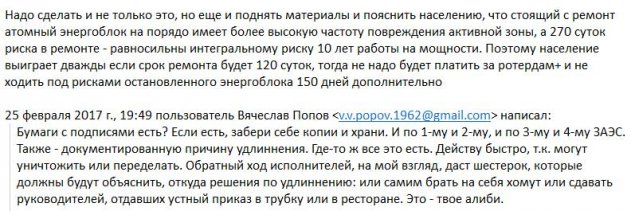 Исходя из текста переписки, реализация преступного плана осуществлялась на пяти уровнях. Особый интерес представляет тот факт, что своими преступными действиями, связанными с ремонтом энергоблоков, руководство ЗАЭС и НАЭК «Энергоатом» фактически сократили срок их эксплуатации на 10 лет. Во второй части письма идет речь о том, что в СБУ решили назначить виновных.