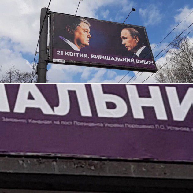 “Отличная реклама Путина на деньги Порошенко. Путин расположен на линии времени в будущем. У него доминирующая позиция. Игра с масштабом (фото Порошенко крупнее) – на самом деле ошибка пиарщиков украинского президента. Визуально создаётся восприятие нахождения Путина с точки зрения зрителя в отдалении, то есть ещё глубже в будущее”, – рассуждает эксперт.
