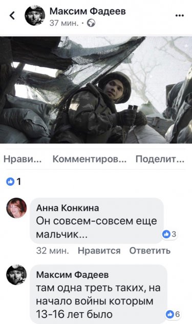 Молодой парень со светлым лицом в масхалате «берёзка» подходит к краю окопа, прощаясь с бойцами с соседней позиции: