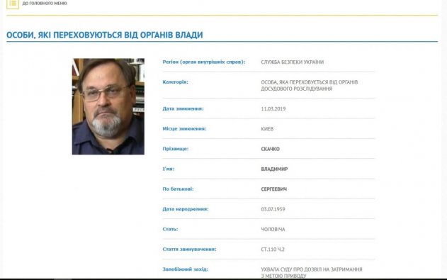 На сайте Министерства внутренних дел Украины появилось сообщение о том, что журналист Владимир Скачко с 11 марта 2019 года скрывается от правоохранителей. Получено разрешение суда на его задержание. Ранее ему было предъявлено подозрение по ч.2 ст. 110 УК Украины (Посягательство на территориальную целостность и неприкосновенность Украины).