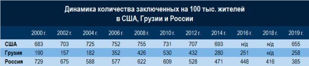 Вообще, в тех государствах, на судебную систему которых оказывали влияние США, число заключенных очень высоко. Из этой таблички хорошо видно, что как только Саакашвили был изгнан, в Грузии стали возвращаться к прежнему состоянию. А вот у нас показатели хуже. Хотя тенденция к снижению есть.