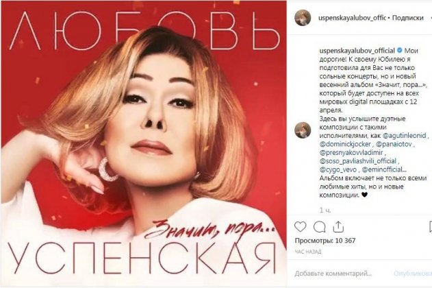 Сегодня певица Любовь Успенская порадовала поклонников неожиданной новостью: к своему юбилею артистка подготовила несколько сольных концертов, а главное - новый весенний альбом «Значит, пора...», который будет доступен на всех мировых digital площадках с 12 апреля. Интересно, что порадовать фанатов своим творчеством певица намерена всего за несколько дней до грандиозного юбилейного концерта своей давней оппонентки Аллы Пугачевой.