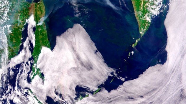 Хуже то, что подобные происшествия случаются в этих местах довольно регулярно. Уж больно сложный климат тут, вокруг Курильских островов. Климат морской, ветровой режим жёсткий, со стороны Охотского моря идёт тёплое течение Соя, со стороны Тихого океана – холодное Курильское течение. Как раз в проливах между островами Уруп, Симушир и Кетой ответвления Курильского течения заходят в гости к течению Соя. Радость от такого свидания с обеих сторон настолько велика, что нередко в этих местах из-за тумана не видно из рубки носа корабля! А уж как выразительно картину таких свиданий рисуют фотоснимки из космоса!