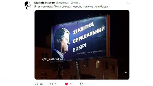 Кто-то в штабе президента посчитал, что хорошо бы снова поиграть с образом Путина. Результат оказался сродни выстрелу в ногу, поэтому плакаты пришлось в спешном порядке переделывать. Порошенко на них остался, а президент России куда-то исчез. Наверное, трусливо сбежал. «Я так понимаю, Путин сбежал, покорно покинув поле борда», — иронизирует народный депутат Мустафа Найем.