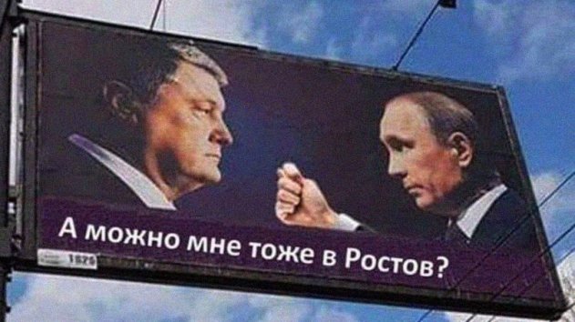 По Сети гуляют многочисленные фотожабы по мотивам «противостояния» Порошенко и Путина. Вот, пожалуй, одна из самых удачных работ — намек на то, что Петр Алексеевич хочет повторить судьбу беглеца Януковича, который поселился в Ростове. Но Путин против.
