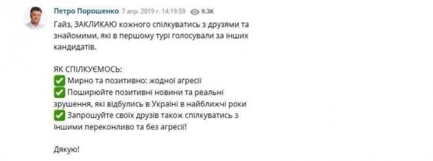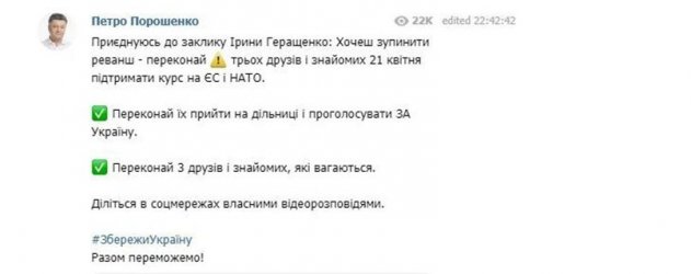 Поднять свой рейтинг в преддверии второго тура действующий гарант пытается и через социальные сети. К примеру, с его страницы раздаются призывы «остановить реванш»: убедить троих друзей и знакомых проголосовать «за Украину», то есть за Порошенко. Хорошая акция, но где призы?