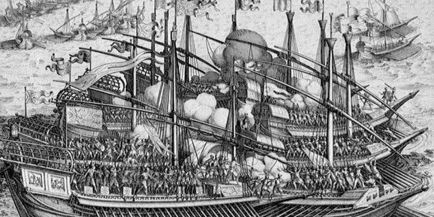 Спустя шесть лет огромные флоты христиан и мусульман сошлись при Лепанто. Мальтийцы не могли остаться в стороне. Их три галеры встали на пути отчаянной атаки левого крыла османского флота под командованием алжирского паши Улуч Али. Корсары пытались любой ценой захватить мальтийский флагман, в абордажном бою на палубе пали тридцать братьев-рыцарей.
