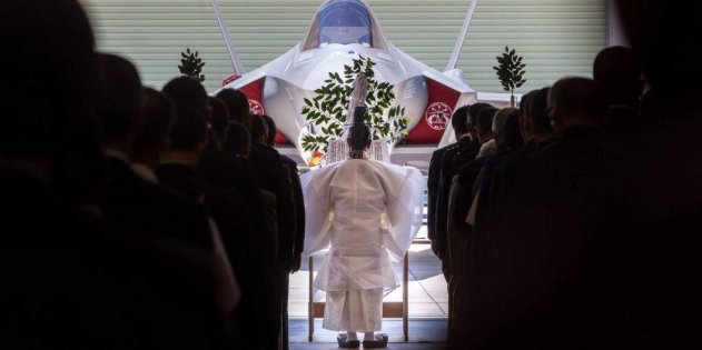 Синтоистский священник благословляет свежеприбывший в Японию F-35A. По иронии судьбы это именно та машина, которая разбилась
