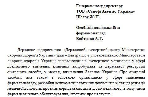 Письмо Экспертной комиссии в адрес генерального директора ООО «Санофи Авентис Украина» с требованием включить информацию о побочных явлениях в инструкции к препарату