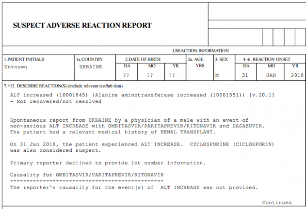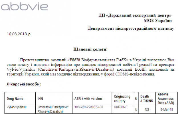 Минздрав Украины приобретает лекарственные препараты западных компаний, несмотря на имеющиеся у них серьезные побочные эффекты. Только за июнь – июль 2018 года государственный экспертный центр Украины зафиксировал огромное количество случаев побочных реакций. Несмотря ни на что, минздрав продолжает допускать в продажу лекарственные средства, вызывающие серьезные побочные эффекты. Все это происходит с подачи исполняющего обязанности министра здравоохранения Украины. Так в стране появился «черный список Супрун» – это перечень препаратов, рекомендованных самим министром. Среди таких препаратов есть «Vylvio/Vyrelakir» американской компании «AbbVie Pharmaceuticals GmbH». Он вызывает внезапное повышение фермента аланинаминотрансфераза в крови, что, в свою очередь, оказывает негативное воздействие на сердце вплоть до инфаркта миокарда. Письмо фармацевтической компании AbbVie Pharmaceuticals GmbH в Центр общественного здоровья МЗУ Вместе с тем, европейское агентство по лекарственным препаратам выявило риск тяжелой брадикардии и блокады сердца при использовании препарата на основе софосбувира/ледипасвира совместно с лекарством «Кордарон». А по сообщениям некоторых зарубежных изданий, побочные явления, возникшие при применении препарата «Харвони», уже привели к многочисленным смертям пациентов. Письмо Экспертной комиссии в адрес генерального директора ООО «Санофи Авентис Украина» с требованием включить информацию о побочных явлениях в инструкции к препарату Очередным препаратом, так же одобренным минздравом, является «Софосбувир» Еще в 2015 году ВОЗ зафиксировала случаи побочных эффектов от его приема. При этом, применение данного лекарственного средства в Грузии привело к многочисленным смертям среди пациентов от побочных явлений Данные ВОЗ о побочных эффектах от препарата «Софосбувир»: Следующим препаратом из «черного списка Супрун» является лекарство «Форксига» британской компании «AstraZeneca UK Limited». Еще в 2015 г. Главный экспертный центр МЗУ зафиксировал случай непредвиденной побочной реакции от его применения. Письмо ГЭЦ украинскому представительству британской компании AstraZeneca UK Limited с просьбой предоставить подробные данные о побочной реакции Кроме того, ведомство официально разрешает проводить на людях клинические исследования небезопасных лекарственных препаратов. Так в 2016 г. министерство здравоохранения официально разрешило тестировать на украинцах почти сотню лекарств. Приказ имеет 96 дополнений-запросов на проведение клинических исследований, в том числе и на. Приказ МЗ Украины от 15.08.2016 г. № 835 на официальном сайте ведомства о проведении клинических испытаний лекарственных средств В 2018 году в украинские больницы поступил препарат «Фитусиран» американской компании «Alnylam Pharmaceuticals», предназначенный для больных тяжелым генетическим заболеванием – гемофилией. При этом с сентября 2017 года экспериментальный препарат «Фитусиран» был запрещен для дальнейших испытаний на территории США, так как были зарегистрированы случаи летального исхода. Сообщение МЗ Украины от 25.05.2018 г. о разрешении тестирования препарата «Фитусиран» на детях Множество зафиксированных случаев проявления побочных эффектов от зарубежных лекарственных средств, одобренных министерством здравоохранения, свидетельствуют о халатном и наплевательском отношен