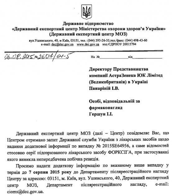 Письмо ГЭЦ украинскому представительству британской компании AstraZeneca UK Limited с просьбой предоставить подробные данные о побочной реакции