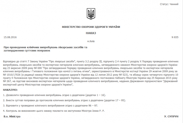 Приказ МЗ Украины от 15.08.2016 г. № 835 на официальном сайте ведомства о проведении клинических испытаний лекарственных средств