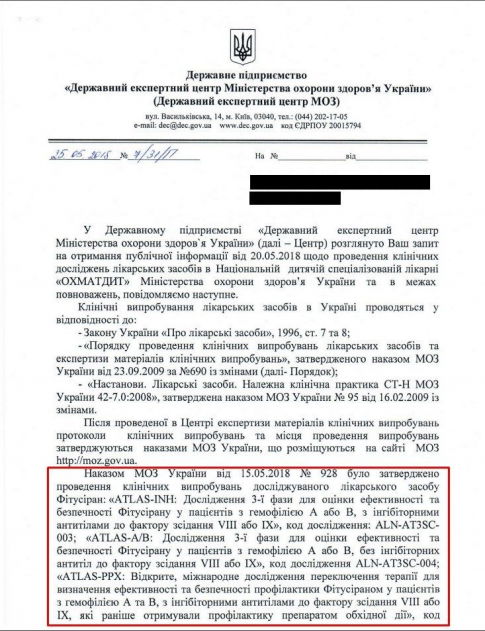 Сообщение МЗ Украины от 25.05.2018 г. о разрешении тестирования препарата «Фитусиран» на детях