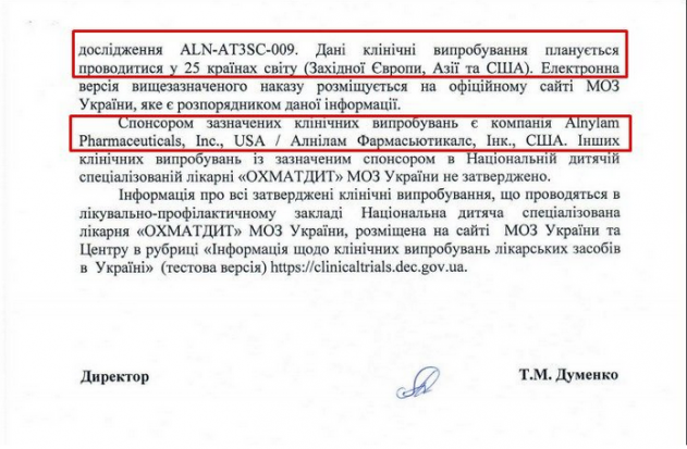 В 2018 году в украинские больницы поступил препарат «Фитусиран» американской компании «Alnylam Pharmaceuticals», предназначенный для больных тяжелым генетическим заболеванием – гемофилией. При этом с сентября 2017 года экспериментальный препарат «Фитусиран» был запрещен для дальнейших испытаний на территории США, так как были зарегистрированы случаи летального исхода.