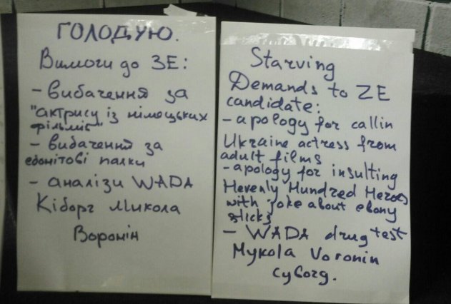 Хрюмберг Николай Воронин потребовал от кандидата в президенты Владимира Зеленского извиниться за оскорбления перед "героями" Евромайдана, "небесной сотни", перед верующими "Православной Церкви Украины" за шутки о томосе и объявил в связи с этим голодовку. Об этом он сообщил на своей странице в Facebook.