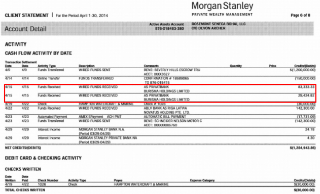 Джон Соломон говорит о прямой заинтересованности Байдена в развитии бизнеса его сына. Банковские записи в США показывают, что американская фирма Хантера Байдена Rosemont Seneca Partners LLC получала от Burisma регулярные переводы на один из своих счетов — обычно более 166 тыс. долларов в месяц в период с весны 2014 г. по осень 2015 г. (в сумме более трех млн. долларов). В это время Джозеф Байден занимал пост вице-президента США и курировал Украину.