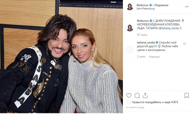В своем Instagram Филипп Киркоров весьма трогательно поздравил с днем рождения Татьяну Навку, назвав ее непревзойденной королевой льда. Поклонники уже обратили внимание на то, что Филипп не единожды высказывал комплименты в ее адрес и относится к фигуристке с большим обожанием, как в недавнем времени восхищался Аллой Пугачевой.