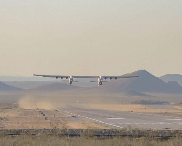 В Сети появилось видео первого полета двухфюзеляжного шестимоторного самолета компании Stratolaunch Systems.