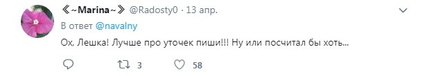 Навальному напомнили и о крупных терактах в метро Москвы и Санкт-Петербурга. Пользователи отметили, что так называемому президенту «прекрасной России будущего» стоило бы больше времени уделять изучению внутриполитической повестки, а не «подсчету уточек». Многие написали, что им стыдно за оппозицию, которая позволяет себе подобные высказывания и мысли.