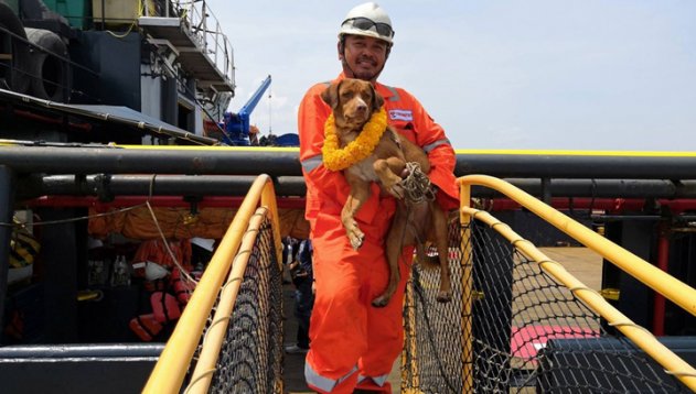 Инцидент произошел в минувшую пятницу в Сиамском заливе Южно-Китайского моря. В тот день рабочие нефтяной вышки увидели в воде собаку, гребущую из последних сил по направлению к платформе.
