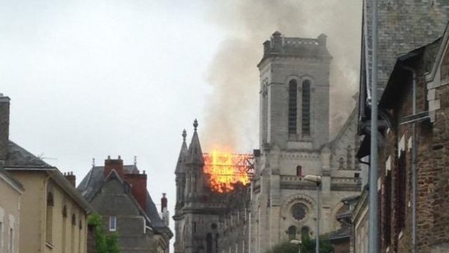 А вот горит крыша на ещё одном готическом соборе – в Нанте, базилика святого Донатьена. Тоже само по себе загорелось. Тоже во время ремонта. В 2015 году.