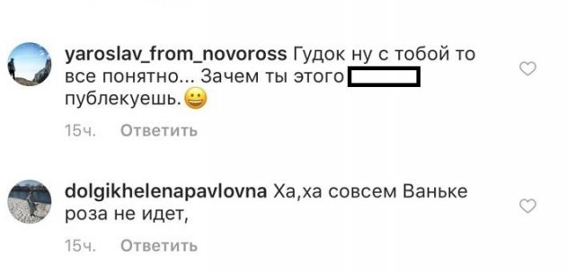 «Хорошо, что хоть не в ..пе», - комментируют хэйтеры. Подписчики удивились: «А почему Ваня, не ответил на такое классное поздравление? Он обиделся!», «Конечно, ему не понравилось, что Гудков палит контору, вот и обиделась, девочка Ванечка». Вполне возможно,что Гудков боится заявить о своей нетрадиционной ориентации. Как ответит на такие заявление сам именниник - пока не понятно. Может быть Иван и вовсе не может определиться на какой он стороне. Если верить официальным данным, то Ваня такой, как и большинство российских мужчин - женат и имеет прекрасных дочерей.