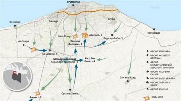 Бои между войсками ПНС и ЛНА идут в районах Айн Зара, Халлетул Ферджан, Каср бин Гашир, Вади ар-Раби, Аль-Матар аль-Адим (старый аэропорт Триполи), Ас-Савани и Аль-Азизия. При этом обе стороны применяют тактику партизанской войны.