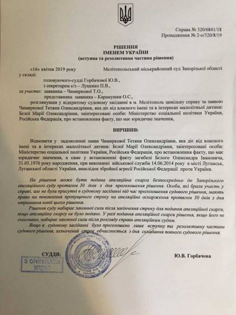 Мелитопольский городской районный суд Запорожской области отказался удовлетворить заявление Татьяны Чимирковой, которая просила признать, что ее муж погиб из-за "агрессии России". Фотокопию решения опубликовал сайт "Громадське ТВ".