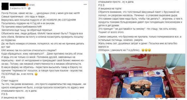 Жительница Норвегии отметила, что её подруга неоднократно лично обращалась в «Почту России», когда спустя время заметила, что извещение о посылке всё не приходит. В отделении ей ничего не говорили, а на просьбы отследить движение почтового отправления по адресу – отказывали. В итоге посылка нашлась через полгода, когда «по невостребованности» пришла назад в Норвегию. Причём, судя по фото, которое к посту прикрепила автор, в ней уже изрядно покопались.