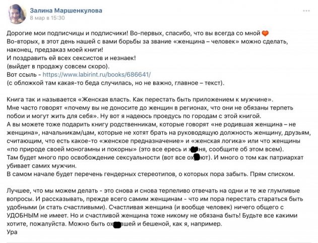 Что ты сделала для общества кроме того, что ввела в оборот слово «блогерка» и пытаешься продать себя подороже только потому, что ты — женщина, которая хочет поделить гендерную принадлежность на сорта и пользоваться тем, что является женщиной, которая вроде как не хочет быть в этом статусе, но бессовестно им пользуется?