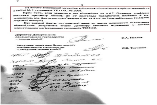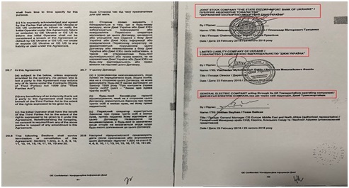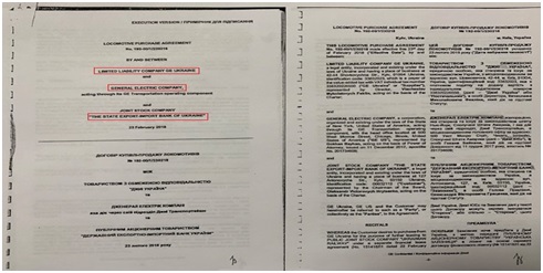 Речь пойдет о контракте между ПАО «Укрзалiзниця» и украинским подразделением компании «General Electric» на закупку Украиной тепловозов и локомотивов на сумму более $1 млрд. при поддержке Государственного эспортно-импортного банка Украины «Укрэксимбанк», который выделял государству средства в лизинг. Приведенные ниже фотографии контракта подтверждают факт согласия на сделку и ее заключения всеми сторонами.
