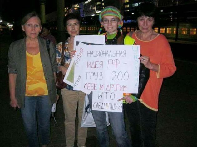 Она отметилась еще с таким плакатом: «Национальная идея РФ – груз 200 себе и другим. Кто следующий? Чечня. Грузия. Украина».