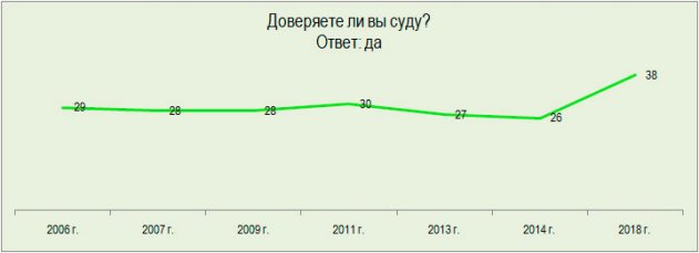 На этом графике не указано, но в 2014 году была зафиксирована самая низкая степень доверия: 30 процентов. Примечательно, что этом же году наш «Левада-центр» показал 26 процентов россиян, доверяющих суду. Что опровергает еще один тезис Владимира Познера — о том, что «все опросы общественного мнения» что-то там ему «показывают». Хотелось бы получить ссылку на уникальные, но никому не известные данные, которые позволяют журналисту делать столь смелые выводы.