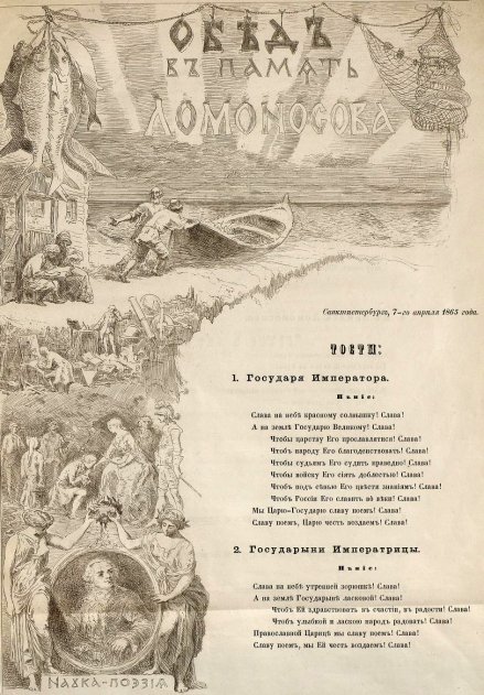 Ломоносовский обед был дан 7 апреля 1865 года, в среду, на Святой неделе. 550 гостей заняли три залы петербургского Дворянского собрания, которые «великолепно» убрали редкими тропическими растениями и цветами. «Эстрада против Императорской ложи представляла рощу огромных лавров, кипарисов, миндальных и померанцевых деревьев.