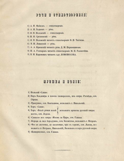 Кроме оперных произведений, хористы и ведущие солисты — Федор Никольский, Осип Петров и Владимир Васильев — исполняли песни на народный лад. Современные поэты — Аполлон Майков и Яков Полонский — читали свои стихотворения.