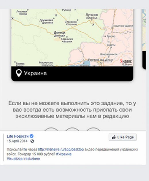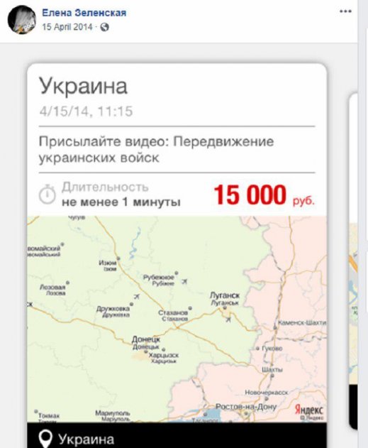 Штаб Порошенко распространяет сведения, что ещё в 2014 году на своей странице социальной сети она перепечатала сообщение телеканала «LifeNews», где предлагалась оплата в 15 тысяч рублей тем, кто предоставит информацию о передвижениях ВСУ в зоне боевых действий в Донбассе.