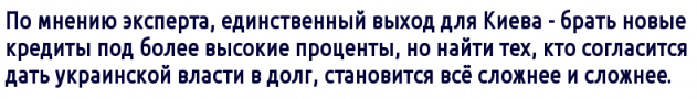 Я уже не говорю про то, что подорожание топлива ведет к удорожанию всего остального, всех товаров. Цены однозначно подскочат. Эти санкции — мощнейший удар по украинской экономике. А ведь сейчас и без того очень тяжелый момент: в течение месяца Украина должна вернуть 1,5 млрд долларов долга кредиторам, хотя в казне нет таких денег, и где их взять, абсолютно непонятно. Не исключаю, что через месяц правительство объявит технический дефолт».