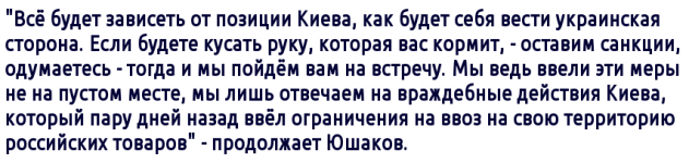 «Вы еще учтите тот факт, что для войны на Донбассе украинским танкам нужна солярка. Солярка — российская. А теперь она будет золотой. Формально Россия ввела ответные санкции на украинские меры, которые были озвучены несколькими днями ранее. Но сравнивать их ни в коем случае нельзя: российский ответ убийственный для нашей экономики».