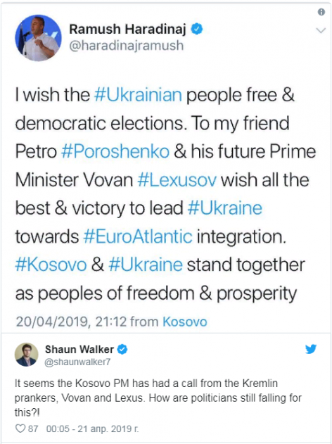 "Премьер" самопровозглашенной республики Косово Рамуш Харадинай в своем Twitter пожелал удачи "будущему премьер-министру" Украины "Вовану Лексусову".