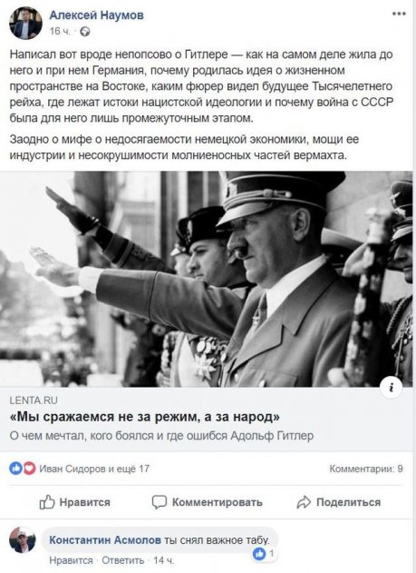 На сайте «Лента*ру», который славится своими дешёвыми кликбейтами (завлекающими и провокативными заголовками) и малолетним редактором Владимиром Тодоровым, гордящимся своей эпатажностью, вчера, 20 апреля 2019 года, вышла статья «Мы сражаемся не за режим, а за народ», посвящённая дню рождения Адольфа Гитлера.