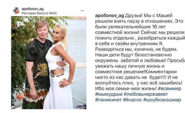 Он провел в браке с женой целых 16 лет и у них есть двое детей, поэтому развод точно должен состояться громкий для Григорьева-Аполлонова. Но сейчас эстрадный певец в своем профиле Instagram все-таки официально признался, что взял паузу в отношения с женой и они сейчас живут не вместе. Видимо, Марине надоела ложь своего супруга, когда с одной стороны он всех уверяет, что в отношениях все хорошо, а с другой проводит время с другими девушками. В итоге супружеская пара разъехалась после 16 лет брака.
